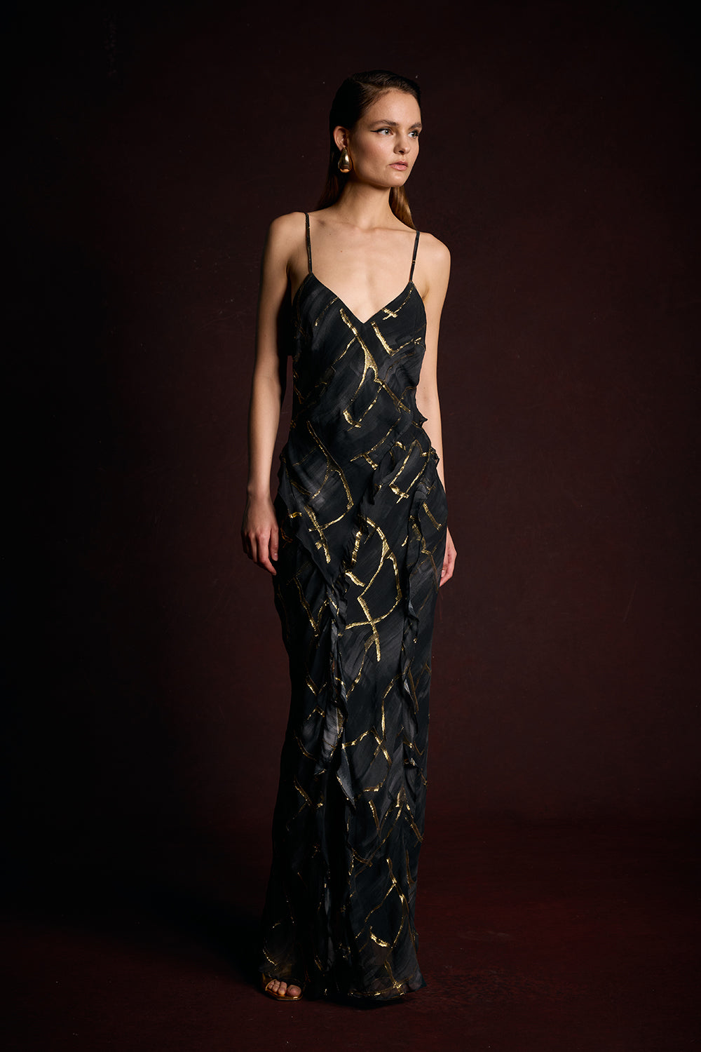 A one-shoulder draped silhouette in a striking red and black painted print. Designed to contour the body with fluid movement and graphic edge, this style features a built-in bodysuit underneath for added structure, coverage, and a smooth, sculpted fit.